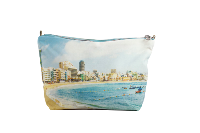 Medidas: 16x25cm. Base 6'5 cm. Material exterior: Sarga de algodón orgánico, material del forro: lona, con enganches de cuero para el asa. Basada en las mejores playas urbanas de Europa, es una enorme extensión de arena rubia situada en el mismo corazón de Las Palmas de Gran Canaria, muy frecuentada durante todo el año. Con sus más de 3 km de largo, este privilegiado enclave está protegido por un arrecife natural, La Barra, antaño explotado como cantera, que discurre en paralelo a la orilla y le proporciona abrigo frente al oleaje del Atlántico.