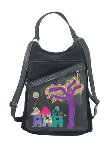 Medidas: 16x25cm. Base 6'5 cm. Material exterior: sarga de algodón orgánico, material del forro: lona, con enganches de cuero para el asa. Basada en el Barranco de Fataga, cerca de las pocas casas antiguas que forman el caserío de Arteara, emerge este frondoso palmeral silvestre de plantas endémicas refugiadas entre riscos y paredones. Un espectacular oasis verde que crece en la zona más fértil del barranco.